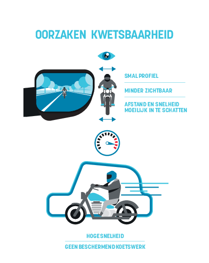 - Een motorrijder rijdt met relatief hoge snelheden, maar is enkel beschermd door zijn helm en motorpak, niet door het koetswerk van zijn voertuig rondom zich. Dat maakt dat een botsing of valpartij een veel grotere impact op hem hebben dan bv. op andere bestuurders.
