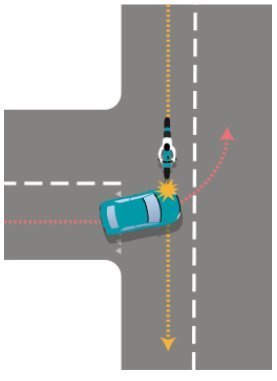 - De motorrijder, die door de aanwezigheid van auto A onvoldoende zicht heeft op het kruispunt, ziet auto B niet aankomen en heeft geen tijd om te vertragen.